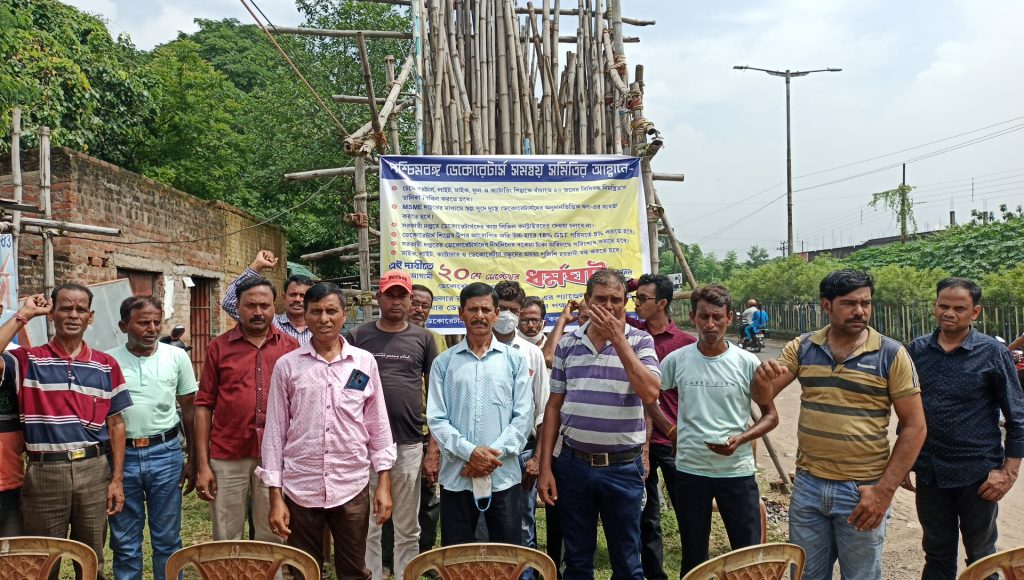 পুরুলিয়া : কোভিড পর্বে লকডাউন এর জেরে ছোট ছোট ব্যবসায়ীরা ভীষণভাবে মার খেয়েছে। কার্যত লাটে উঠেছে ব্যবসা। কর্মচারীদের বেতন দিতে এবং সংসার চালাতে হিমশিম খাচ্ছেন ক্ষুদ্র ব্যবসায়ী মালিকরা। ডেকোরেটর ব্যবসা একেবারে ভয়ংকরভাবে খারাপ। কিভাবে ব্যবসা চালাবেন তা বুঝে উঠতে পারছেন না ।পশ্চিমবঙ্গ ডেকোরেটার্স সমন্বয় সমিতির আহবানে 6 দফা দাবিতে সোমবার ধর্মঘটের সমর্থনে অবস্থান কর্মসূচি পালন করল পুরুলিয়া রঘুনাথপুর প্যান্ডেল, লাইট, সাউন্ড অফ ফ্লাওয়ার্স ডেকোরেটর সমন্বয় সমিতি। তাদের দাবি তাদের জীবন-জীবিকা ও শিল্প বাজাতে এগিয়ে আসতে হবে সরকারকে। স্বল্প সুদে ঋণের ব্যবস্থা করার দাবি তুলেছেন তারা।