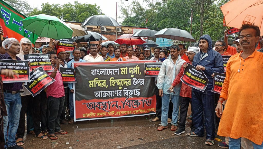 পুরুলিয়া : বাংলাদেশের সংখ্যালঘু হিন্দুদের মূর্তি , মন্ডপ ভাঙ্গার প্রতিবাদ ও সেখানকার সংখ্যালঘুদের উপরে মৌলবাদীদের বর্বর অত্যাচারের বিরুদ্ধে পুরুলিয়া জেলা বিজেপির পক্ষ থেকে রঘুনাথপুর মহকুমা আদালত মোড়ের কাছে বিক্ষোভ প্রদর্শন করলেন বিজেপি নেতা ও কর্মীরা। সোমবার বৃষ্টিকে উপেক্ষা করে এই কর্মসূচিতে শামিল হন রঘুনাথপুরের বিজেপি বিধায়ক বিবেকানন্দ বাউরী, কাশীপুরের বিজেপি বিধায়ক কমলাকান্ত হাঁসদা, পাড়া বিধানসভার বিজেপি বিধায়ক নদীয়ার চাঁদ বাউরী সহ জেলার ২ সম্পাদক ও বিজেপি নেতা ও কর্মীরা।