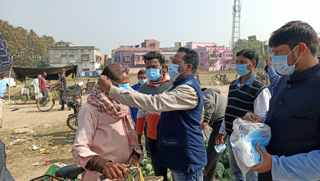 পুরো রাজ্যের পাশাপাশি করোনার উদ্বেগ বেড়ছে পুরুলিয়া জেলার রঘুনাথপুর শহরে। ইতিমধ্যে পুরুলিয়া জেলায় করোনা আক্রান্ত হয়েছেন 557 জন জেলাবাসী ।জেলার রঘুনাথপুর পৌরসভা এলাকায় করোনা আক্রান্ত সংখ্যা ইতিমধ্যে কুড়ি ছুঁয়ে গেছে। এই সংক্রমণ থেকে মানুষকে মুক্তি দিতে মাস্ক নিয়ে রাস্তায় নেমে পড়লেন তৃণমূলের জেলার সাধারণ সম্পাদক হাজারী বাউরী। শুক্রবার হাজারী বাউরি সহ তার অনুগামীরা রঘুনাথপুর দৈনিক বাজারে পৌঁছে মাস্ক বিহীন ক্রেতা ও বিক্রেতাদের মাস্ক পরিয়ে তাদের এই করোনাভাইরাস নিয়ে সচেতন করেন।