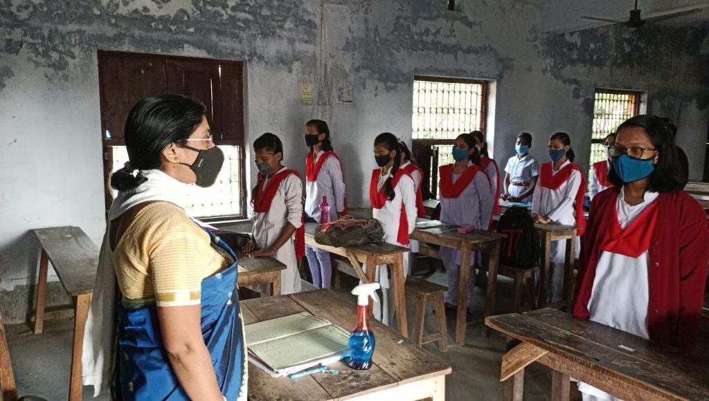 পুরুলিয়া (রঘুনাথপুর):করোনাকালে ফের খুলল স্কুল কলেজ, মঙ্গলবার পুরুলিয়া জেলার রঘুনাথপুর উচ্চতর বালিকা বিদ্যালয়ে স্কুল খুলতেই খুশি ছাত্রীসহ স্কুলের শিক্ষিকা রা। দীর্ঘ কুড়ি মাস পরে স্কুলের ঘন্টার আওয়াজ শুনে আবেগে ভাসলো ছাত্রী থেকে শিক্ষিকারা। এদিন রাজ্য সরকারের নিয়ম বিধি মেনে পড়ুয়ারা পৌঁছালো স্কুলে, সকলের মুখে দেখা গেল মাক্স, ক্লাস রুমে ঢুকার সাথে সাথেই শিক্ষিকা তাদের হাতে দিলেন স্যানিটাইজার, দূরত্ব বজায় রেখে ক্লাসের মধ্যেই হল পার্থনা।
